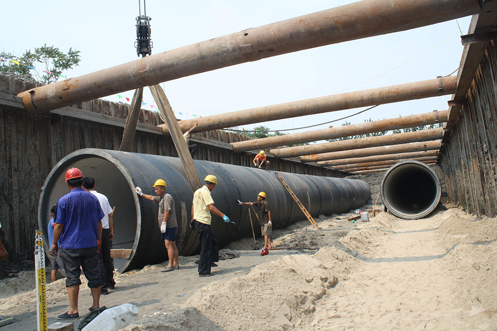 東郊污水處理廠是亞洲在建的半地下污水處理廠,建成后污水處理能力為60萬噸/天,再生水能力10萬噸/天,承擔著城市污水凈化的使命。澤寶公司負責供貨的進水、再生水管網項目是該工程的重要組成部分。該段頂管是本市乃至華北地區達到直徑4米的頂管項目,采用外徑4.8米內徑4米混凝土套管內穿直徑3米玻璃鋼夾砂管的形式穿越京津塘高速高架,穿越距離長達131米。
